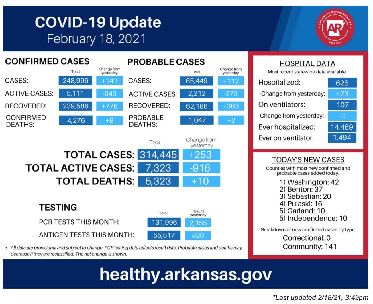 The Department of Health on Thursday reported Arkansas’ COVID-19 deaths now total 5,323. The state’s new virus cases grew by only 253 to 314,445. COVID-19 hospitalizations rose by 23 to 625.