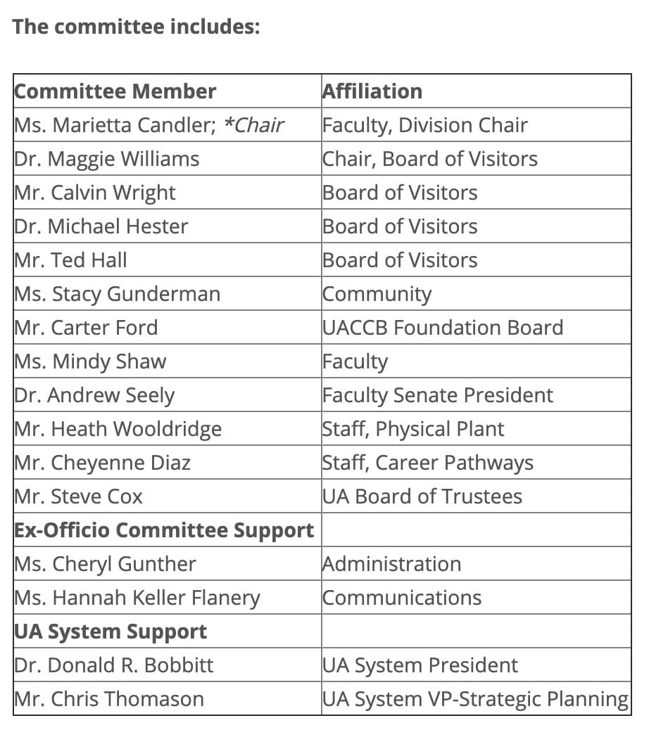 Marietta Candler, division chair of Nursing and Allied Health at UACCB and a 27-year employee at the institution, will chair the search committee, which also includes key members of the campus community (faculty, staff), local leaders that make up its board of visitors and foundation board, and a member of the UA Board of Trustees.
