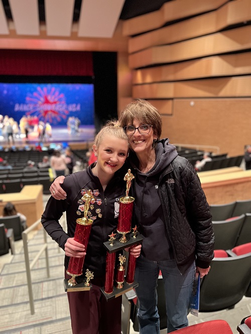Chloe Massey (with NADT Director Cindy Hubberd) with her first-place finish for her solo, “Drop Everything,” also choreographed by Adamson.
