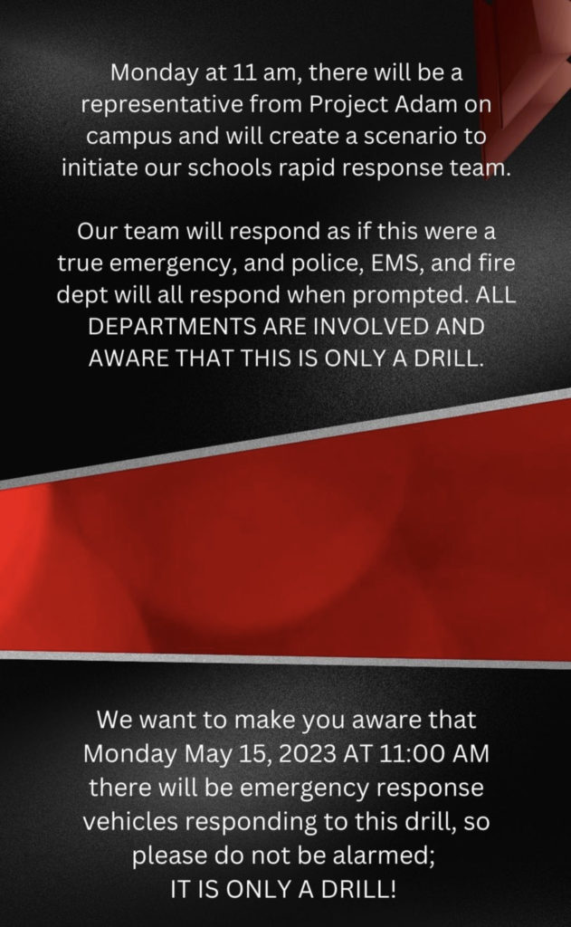The drill will involve a scenario created by a representative from Project Adam, which will initiate the school’s rapid response team.