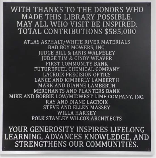 Notable donors acknowledged by the Independence County Library include Atlas Asphalt, White River Materials, Bad Boy Mowers, Inc., Judge Bill and Janis M. Walmsley, Judge Tim and Cindy Weaver, First Community Bank, FutureFuel Chemical Company, Lacroix Precision Optics, Lance and Kimberly Lamberth, Mark and Dianne Lamberth, Merchants and Planters Bank, Mike and Bobbie Low, Midwest Lime Company, Inc., Ray and Diane Lacroix, Steve and Ellen Massey, Willa Harkey, and Polk Stanley Wilcox Architects.