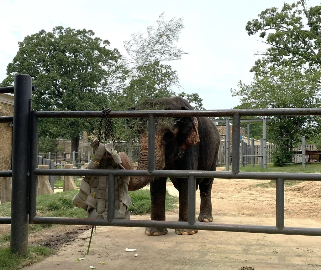 “It took us a little while to figure out how to properly weave two firehoses and safely secure them together to create a mat with slots for fruits and vegetables,” Koons said. “It was such a rewarding and exciting experience to be able to observe the elephants explore the mats and find their food.”