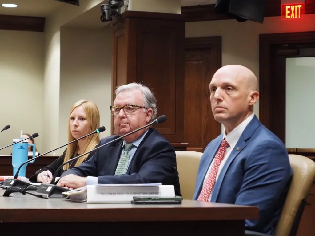 Danni Hoefer, Doyle Webb and Michael Marchand (left to right) with the Arkansas Public Service Commission answer questions about a proposed natural gas rate increase from lawmakers during a committee meeting on Oct. 28, 2024. (Mary Hennigan/Arkansas Advocate)