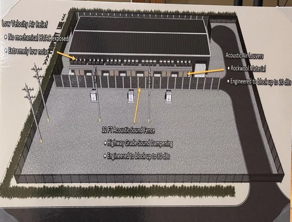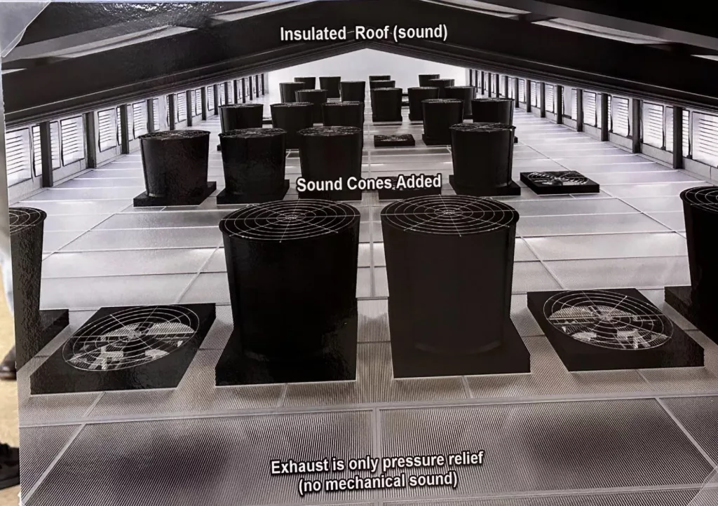 Stephens said Artemis, in its design of this facility, has addressed noise as one of the residents’ chief concerns with design features such as sound cones on the interior, an insulated roof, and pressure-relief exhaust to minimize fan noise. Outside, there will be a 12-foot acoustic fence blocking up to 30 decibels of sound, much like a highway-grade sound-dampening barrier, and acoustic louvers to block up to an additional 20 decibels.