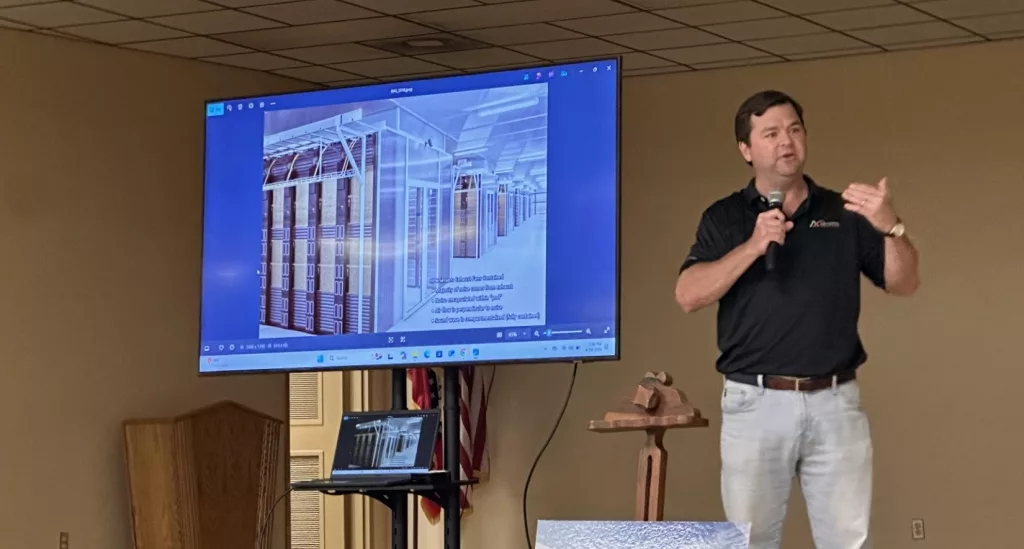 Above: Sharp County Judge Mark Counts speaks at last night’s public meeting with developers of a new bitcoin data mining center.