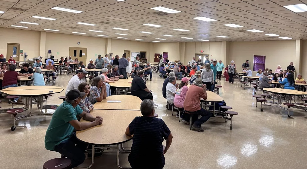Cave City-area residents listen at last night’s public meeting with developers of a bitcoin data mining center planned just outside the city limits.