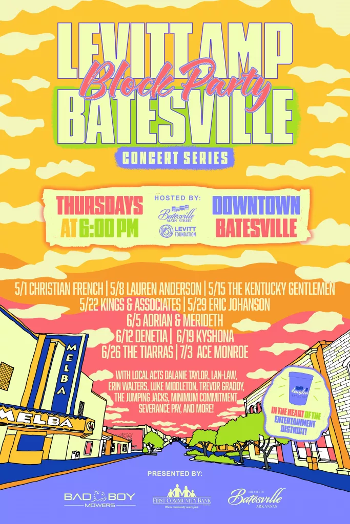 Hosted by Main Street Batesville in partnership with the Levitt Foundation, the free outdoor concert series will take place every Thursday at 6 p.m. through July 3. Organizers say the 2025 season will feature a blend of nationally touring musicians and local performers.