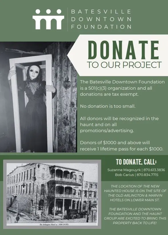 She said the foundation is different from the Main Street Batesville organization. “The foundation was created when they started building Maxfield Park. The mission of the foundation kind of changed after that. They help support the merchants in ways that are different from what Main Street does,” she went on to say. “The foundation is the parent organization (for The River Haunt Hotel), and the funds we raise through the haunt will go back to downtown.”
