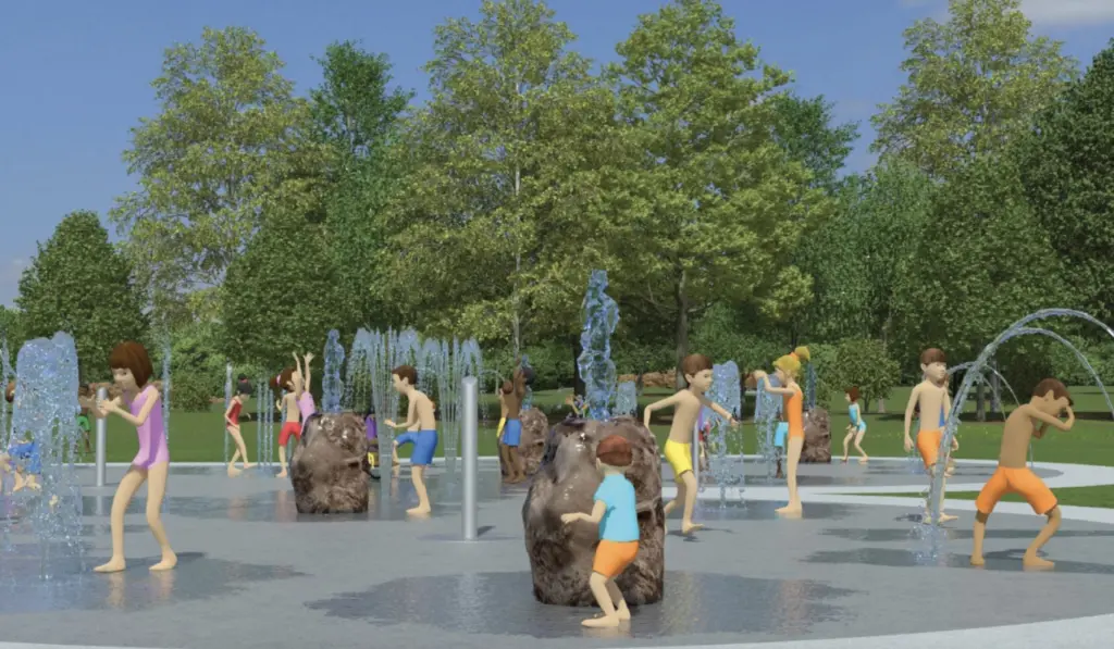 Water Play (above) and Nature Play: Near the playground, children will find interactive water and nature play areas that celebrate the park’s riverside setting. These elements enable children to splash, climb, and explore, helping them learn through unstructured outdoor play — a proven method that enhances problem-solving, emotional regulation, and physical health.