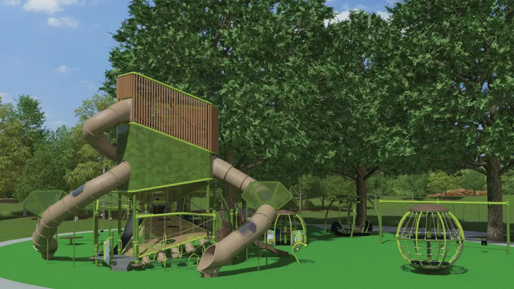 Inclusive Play: The new playground at Riverside Park is designed to serve children of all ages and abilities, ensuring universal accessibility. Unlike traditional playgrounds, it will feature a sensory-rich, nature-inspired environment that encourages creativity, imagination, and social connection. Thoughtful grading, materials, and equipment selection ensure that all children can play together in the same space, including those with mobility, sensory, or cognitive challenges.