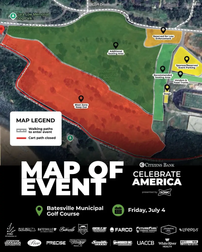 The annual Citizens Bank Celebrate America, sponsored by Sonic, will be held Friday at the Batesville Municipal Golf Course instead of its traditional home at Riverside Park.
