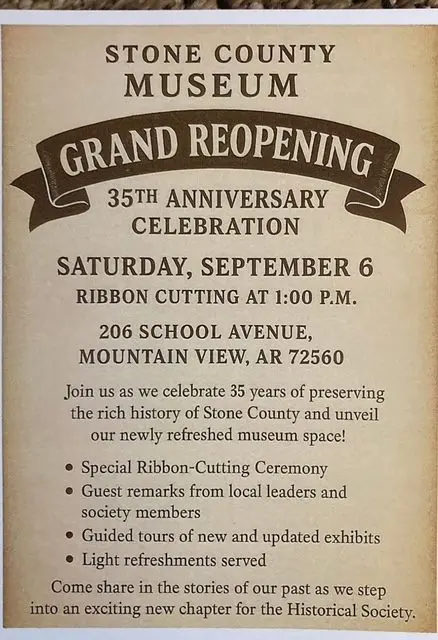 The Stone County Museum will host a grand reopening on Saturday, Sept. 6, 2025, following extensive renovations to the historic building.