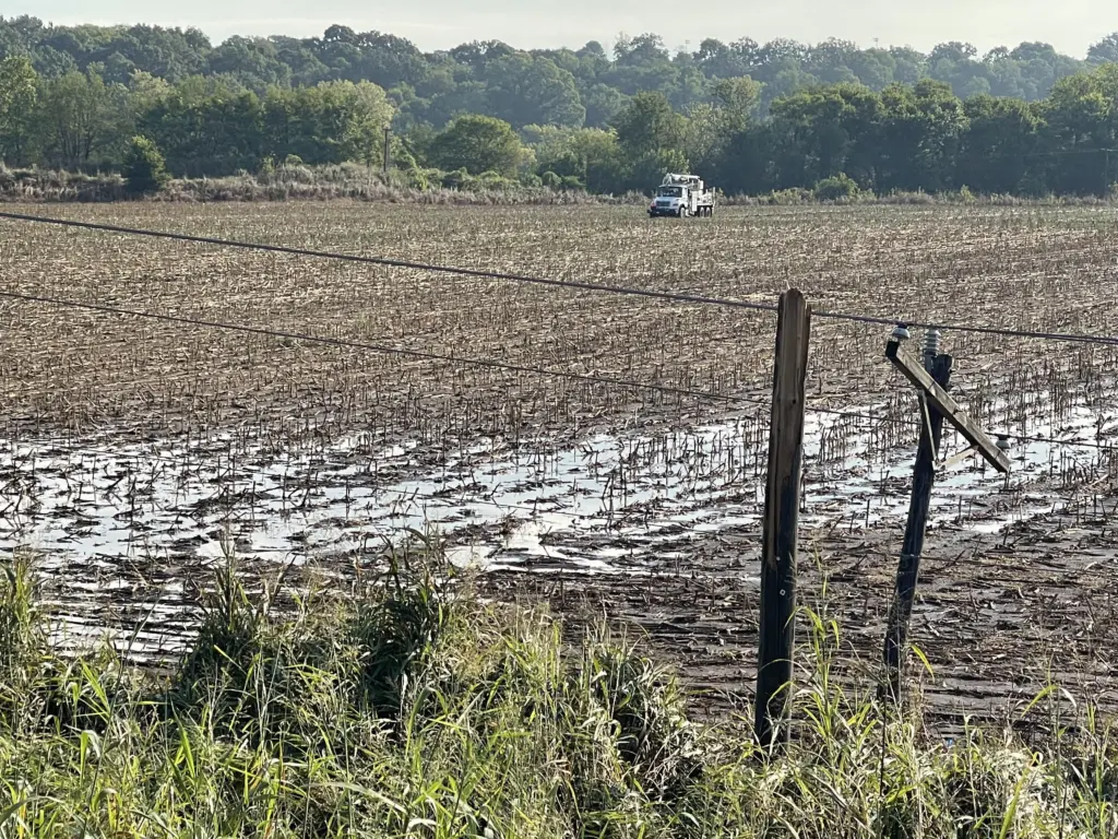 Linemen worked Friday morning to repair utility poles snapped by strong winds after heavy storms swept through Batesville and surrounding areas, leaving behind flooded roads and downed infrastructure but no immediate reports of injuries.