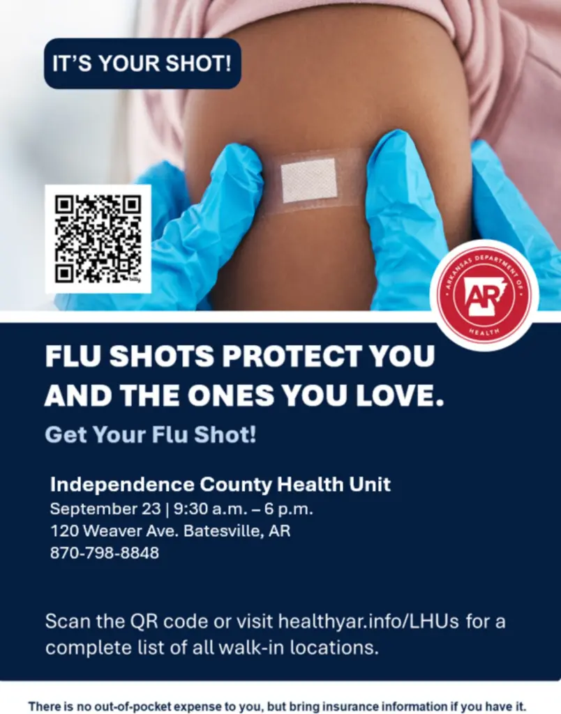 The Independence County Health Unit will host a walk-in clinic Tuesday, Sept. 23, from 9:30 a.m. to 6 p.m. at 120 Weaver Ave. in Batesville. Residents are asked to bring insurance cards, but vaccinations will be provided at no cost even for those without coverage.