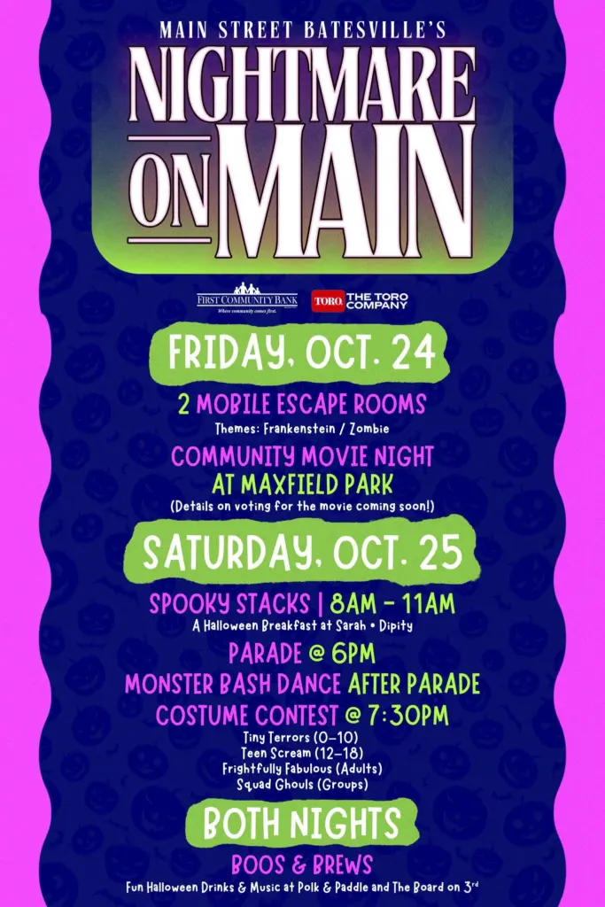 Main Street Batesville’s annual “Nightmare on Main” celebration returns Oct. 24–25 with two days of Halloween-themed fun in downtown Batesville — and this year, there’s no registration fee to join in.