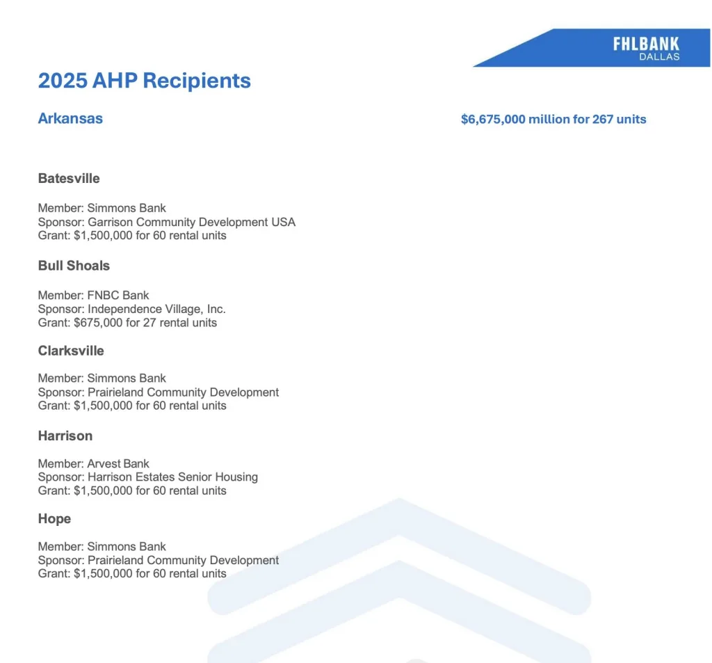 The funding, awarded through FHLB Dallas’ Affordable Housing Program, is part of $6.7 million designated for Arkansas projects, supporting a total of 267 housing units statewide. The Batesville project is sponsored by Garrison Community Development USA in partnership with Simmons Bank.