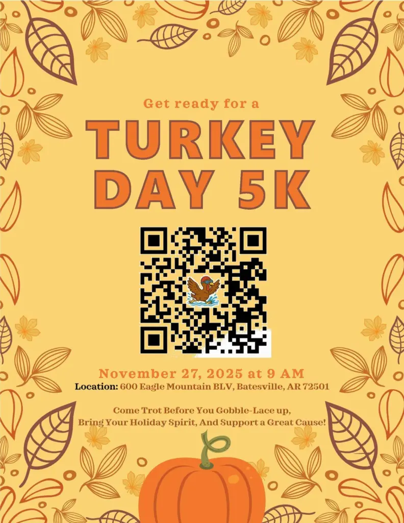 Runners, families, and community members are invited to kick off Thanksgiving morning with the annual Turkey Day 5K, a fun run and fundraiser supporting the Batesville Swim Team. The event will take place on Thursday, Nov. 28, at 600 Eagle Mountain Blvd., with the race beginning at 9 a.m.