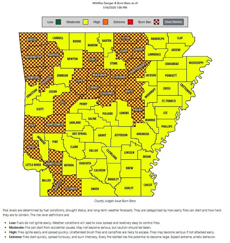 Forecasters note that very dry air, critically dry short-term fuels (fine, dead vegetation that has lost nearly all its moisture), and gusty northwest winds are expected to keep local wildfire danger elevated. Dry conditions and winds are raising concerns that sparks or uncontrolled burns could spread quickly, and some counties may be under burn bans as a precaution.