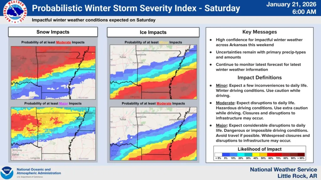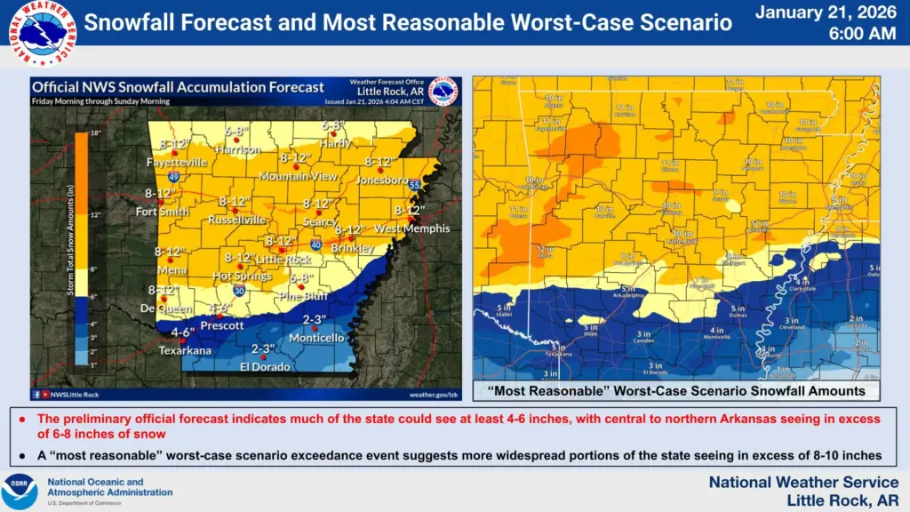 The National Weather Service says the storm will hit Friday afternoon and last through early Sunday. Northern Arkansas could see 4 to 8 inches of snow—possibly more than 10 inches in some spots. Southern counties face a bigger threat from ice, with up to half an inch of freezing rain that could snap tree limbs and knock out power.