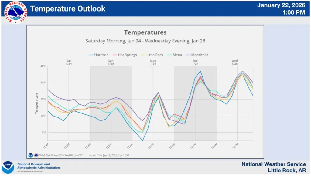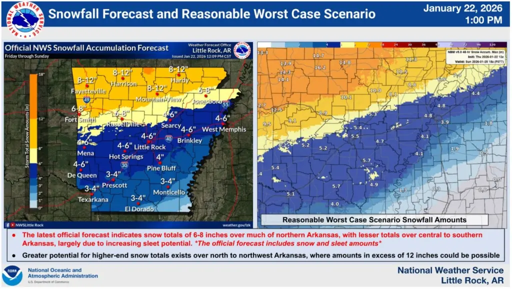 The National Weather Service in Little Rock has issued a Winter Storm Watch from Friday afternoon through late Saturday night for much of northern Arkansas, including the Ozarks and the Delta. Forecasters say several inches of snow are possible in north central and northeast counties, along with periods of sleet and freezing rain that could lead to hazardous travel, power outages, and downed trees. Arctic air moving in behind the system could drive wind chill values well below zero late Saturday into Sunday.