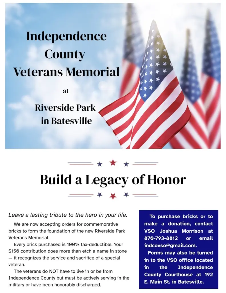 Morrison also said the memorial will not be specific to Independence County. “It will be a national memorial placed perfectly in our own backyard. It will be a significant landmark, great for tourism, patriotic ceremonies, and school field trips. And most importantly, a place dedicated to honoring veterans and preserving their sacrifices through service for a lifetime.