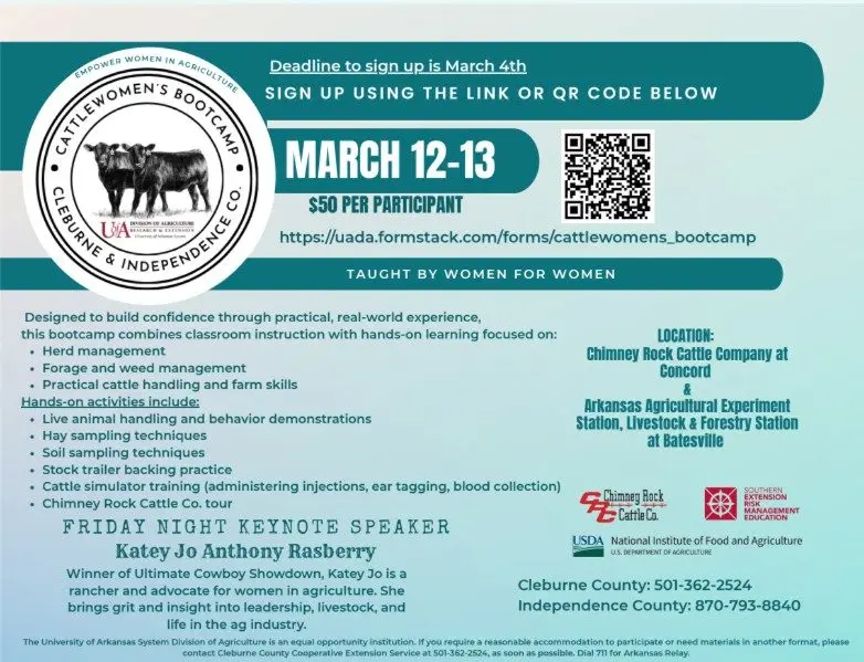 Cleburne and Independence counties will join forces to host the third annual Cattlewomen’s Bootcamp on March 12-13, offering a hands-on learning experience focused on cattle production and management.