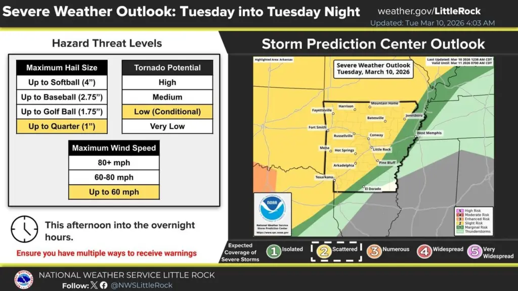 Officials note the active weather pattern comes during Arkansas Flood Safety Awareness Week. Residents are encouraged to review emergency plans, have multiple ways to receive weather warnings, and avoid driving through flooded roadways during periods of heavy rain.