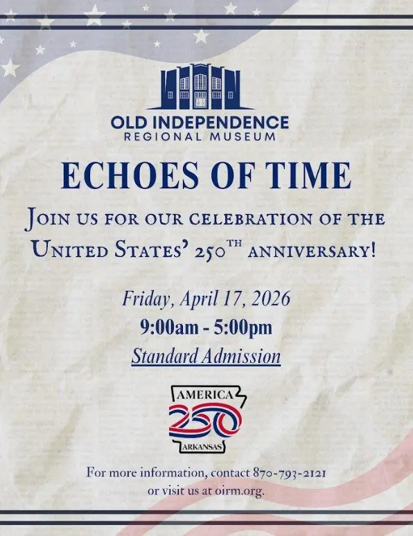 The Old Independence Regional Museum announced the April 17 opening of “Echoes of Time,” a commemorative exhibit honoring the 2026 national milestone. The display bridges the gap between the Revolutionary War and modern civic life, focusing on Independence County’s unique namesake and its ties to the American story.