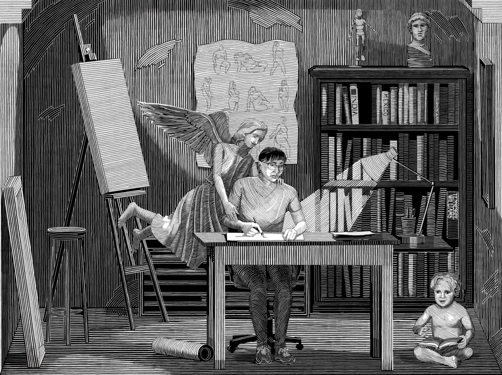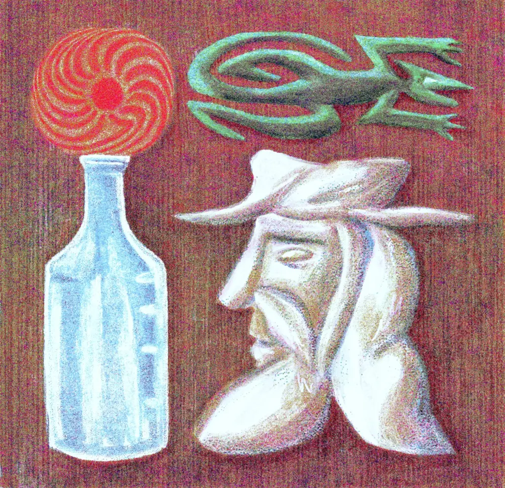 In Treasure Signs, Brian Wolf created images depicting his own personal symbols, which help him connect to his inner world. These strange characters and their interactions come to life in layered color pencil drawing, flat acrylic paintings, or assembled with ceramic and found objects.