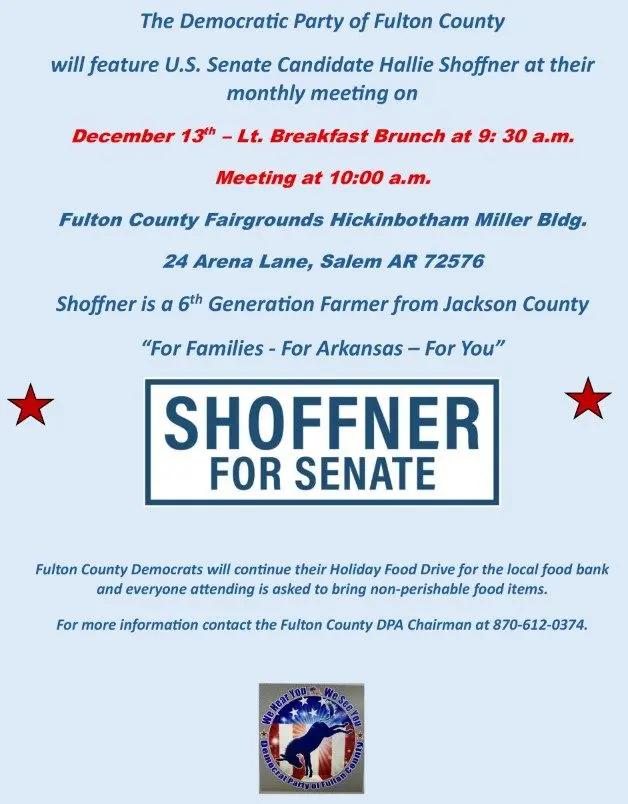 The Fulton County Democratic Party will meet on Saturday, December 13, 2025, in the Hickinbotham-Miller Exhibit Building at the Fulton County Fairgrounds, 124 Arena Lane, Salem, Arkansas. A brunch will be served at 9:30 a.m., followed by the short business meeting at 10:00 a.m. RSVP is not required but is suggested so the committee can plan for food. Call the one of the officers: Heath Shrable at 870-612-0374, Barbara Moody at 501-912-0608, Amy Wilcox (870-371-2337, or Carolyn Lewis at 870-321-3193.