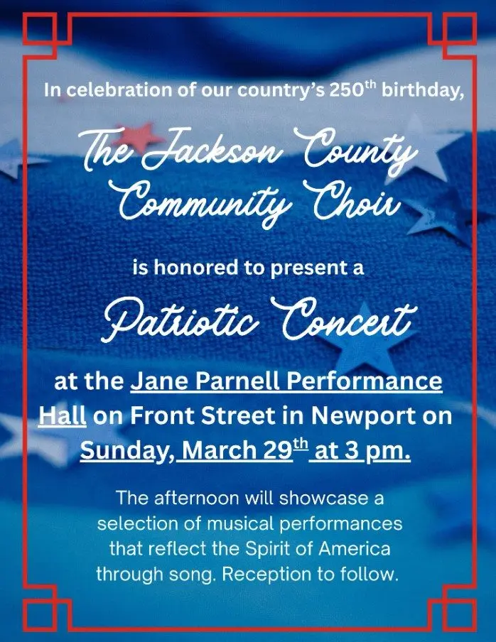 The Jackson County Community Choir is celebrating America’s 250th birthday a little early. The Choir will present a Patriotic concert on Sunday, March 29th, at 3:00 p.m.