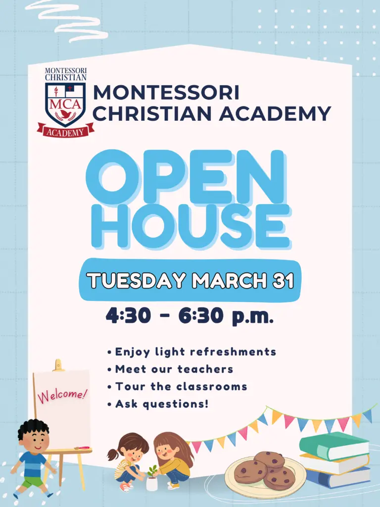 Interested in learning more about Montessori Christian Academy? Join us at our Open House on Tuesday, March 31 from 4:30–6:30. This free event is a wonderful opportunity to meet our teachers, tour our classrooms, and ask any questions!